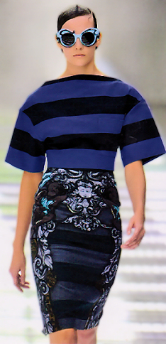 Ritmo sudamericano: Prada Atmosfere pop-barocche Atmosfere latine, ritmo sudamericano, new pop, pop-barocco. Fuochi d'artificio cromatici, volant e palette accesa. La donna 2011 di Prada è una figura sicura di sé, che gioca ad appropriarsi di un ruolo da film, intenso e carico. Sta avvicinando sensazioni forti di colore. E molte righe, orizzontali, larghe, pregnanti. Forme estremamente semplici, ultimo retaggio del minimalismo, afferma la stilista. Poi le stampe degli abiti, invece, vivono un ritmo sudamericano, con decori fatti di fregi e puttini barocchi, di fantasie con geroglifici etnici, new pop. Le linee sono dritte e rigorose e, nei modelli più interessanti, hanno importanti spalle a reaglan, quasi di stile giapponese, oppure, in alcune maglie, esse ricordano tagli mitici degli anni '50. Di questi anni è anche la sottolineatura del punto vita. Molti abiti si reggono su sottili spalline a canottiera, con stampe con disegni di scimmie e frutta, banane, ananas, che richiamano le mise molto micro di Josefhine Baker. Spesso gli orli terminano in un alto volant e le lunghezze sono al ginocchio. I capelli vengono raccolti in due piccoli chignon, gli occhiali appaiono scenografici, vistosi, spavaldi. Proposte decisamente molto sopra le righe, che sembrano isolare la figura femminile in un Iperuranio, dove solo lei può vivere. Ed invece è un invito. Chi vuole partecipare, partecipi. Chi vuole entrare, entri. In questo mondo fantastico, come un quadro barocco, che provoca e sembra celare enigmatici modi di vita. E' una sfida. Per poche. Solo per poche. L'ispirazione si rivolge a un'attrice dalla predilezione per un decorativismo sensuale iperbolico della propria immagine, esuberante di frutta e fiori, come Carmen Miranda. Più ancora il pensiero corre a Frida Kalho, mitica pittrice messicana, dalla vita sofferta e carica di ostacoli, ma anche piena di ispirazione e di vena artistica. Si rispecchia, così, con il richiamo a questa figura, l'immagine di una donna, oggi più consapevole, originale, di carattere, che intende esprimere qualche cosa che sta sentendo in sé con forza, un preciso modo di vita che sta realizzando.