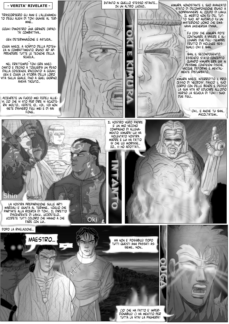 Termina l'allenamento dei tre allievi di Toki (Gouki, Gen e Ouga ormai diventati abili guerrieri) e il Maestro decide di svelar loro il segreto delle loro origini raccontando loro di essere in realtà non figli suoi ma del malvagio Kimura, tacendo invece sulle autentiche origini di Gouki; la reazione dei tre è imprevedibile e durante la notte uno di loro uccide Toki (ormai vecchio e decrepito) che però riesce a fare una predizione al suo assassino. Gouki in quelle stesse ore parte per il Giappone per trovare Kimura (colui che crede essere suo padre); Ouga invece, preso dall'ira, su aggira per l'isola di Phsatura per trovare Gen e ucciderlo; Gen imbattutosi nel compagno di allenamento impazzito riesce a praticare su di lui una tecnica che assopisce la mente e annebbia la memoria mettendo così in salvo la propria incolumità e nel contempo preservando la vita di Ouga. |